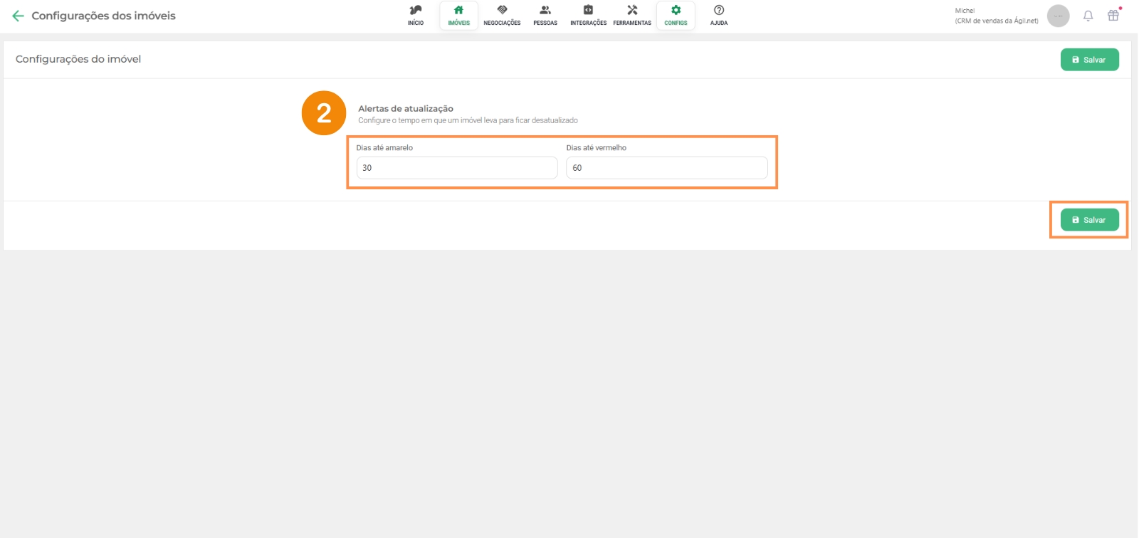 2 – Você escolhe o dia de alerta para atualização dos imóveis, quando estiverem pouco desatualizados (amarelo) e muito desatualizados (vermelho), após escolher os dias de alerta para atualização, clique em “Salvar“.