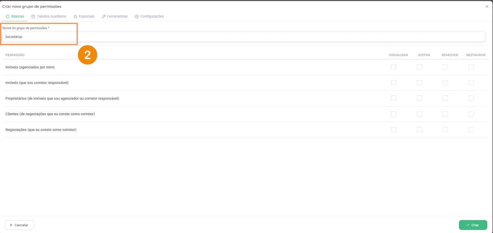 2 – Adicione um nome ao seu Grupo de Permissões para facilitar a identificação. No exemplo, colocamos o nome como “Secretárias“, ou seja, sinalizando que esse grupo contém permissões exclusivas para secretárias: