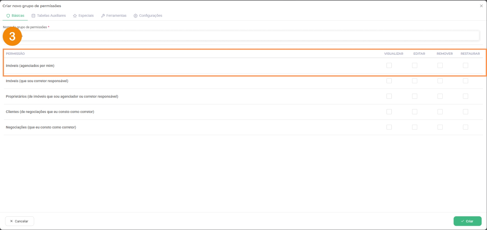 No item “Imóveis (agenciados por mim)”, é possível conceder as seguintes permissões: