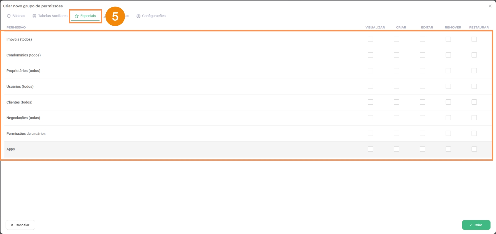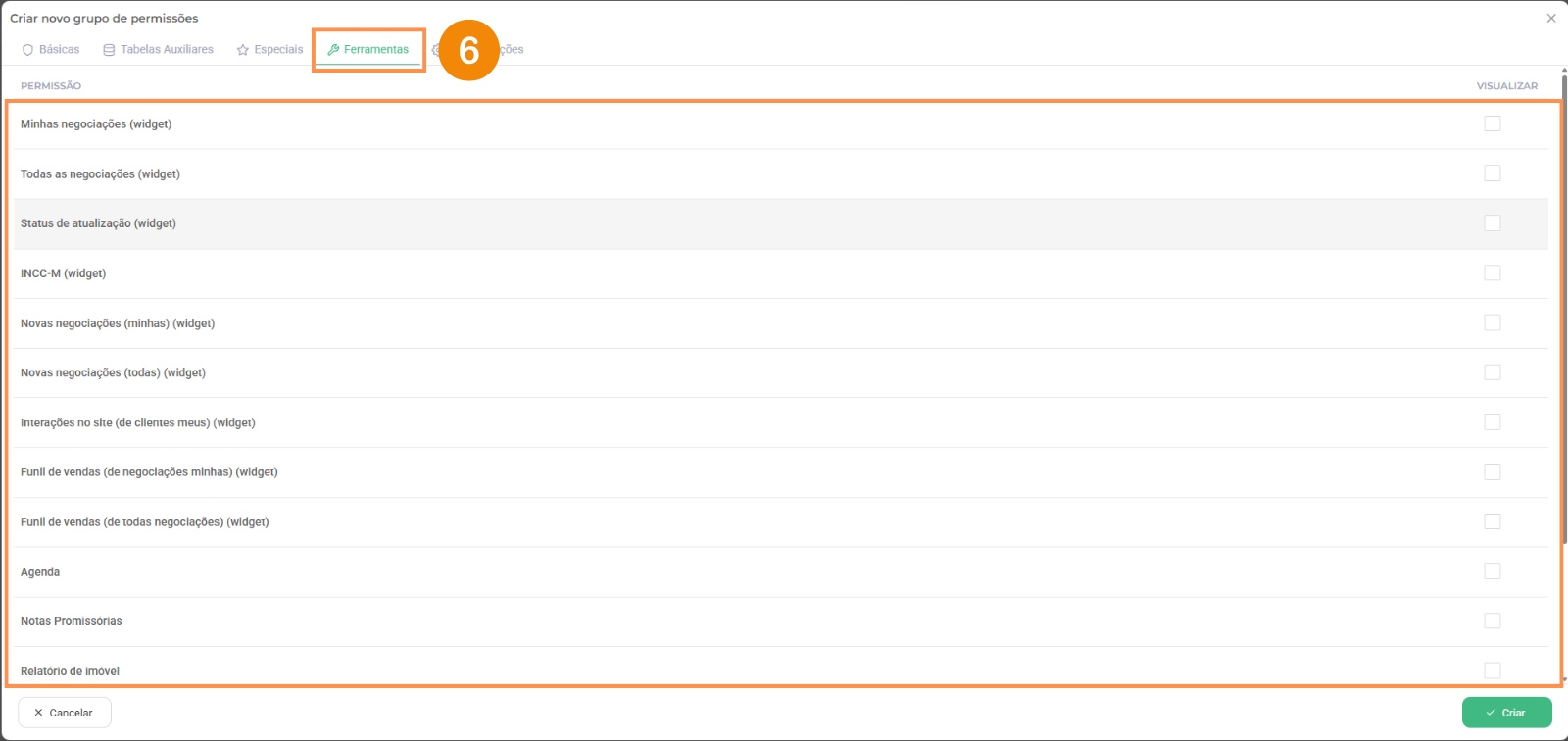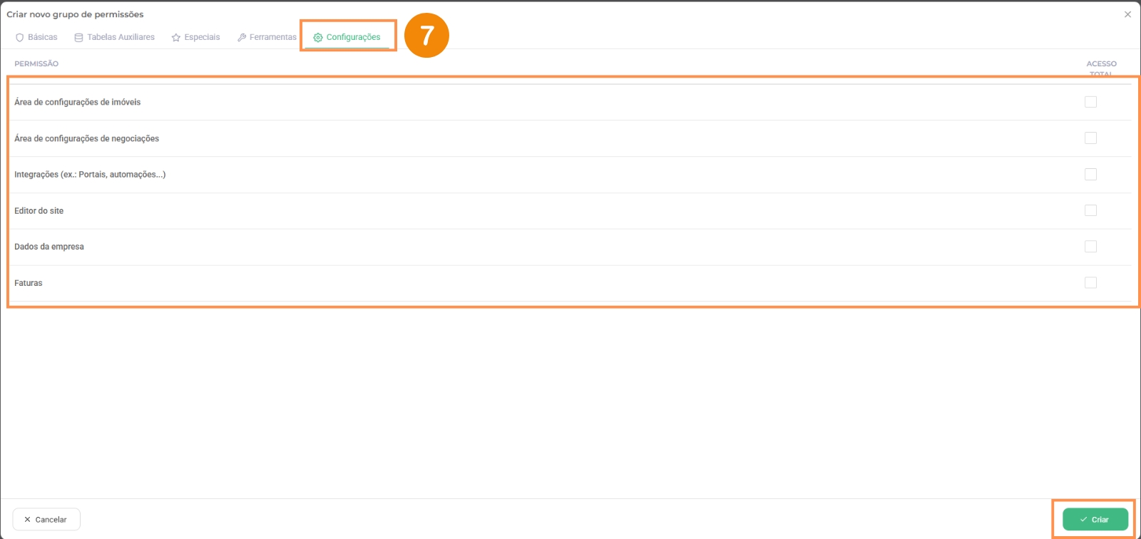 7 – Por último, temos a “Configurações“, que faz referência a site, negociações, integrações e outras. Após conceder todas permissões que deseja a esse grupo, você pode “Criar“: