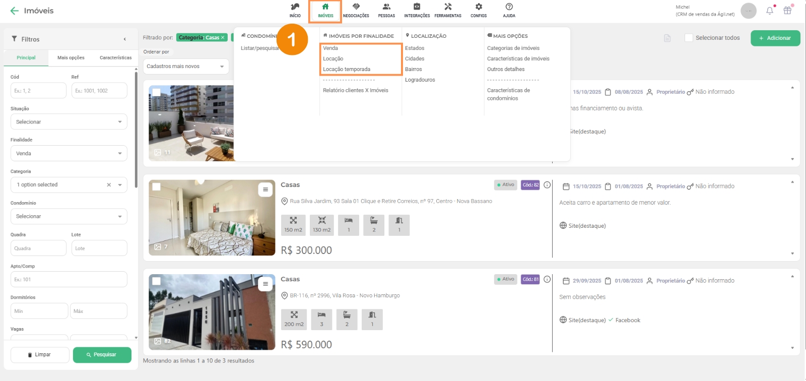 1 – Clique em “imóveis“, no submenu clique em “venda” que iremos usar para nosso exemplo;