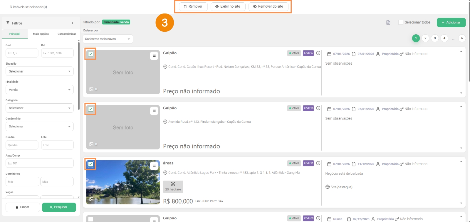 3 – Você tem a opção de marcar todos os imóveis, assim liberando algumas opções como remover os imóveis selecionados, adicionar os imóveis ao site e remover os imóveis do site;
