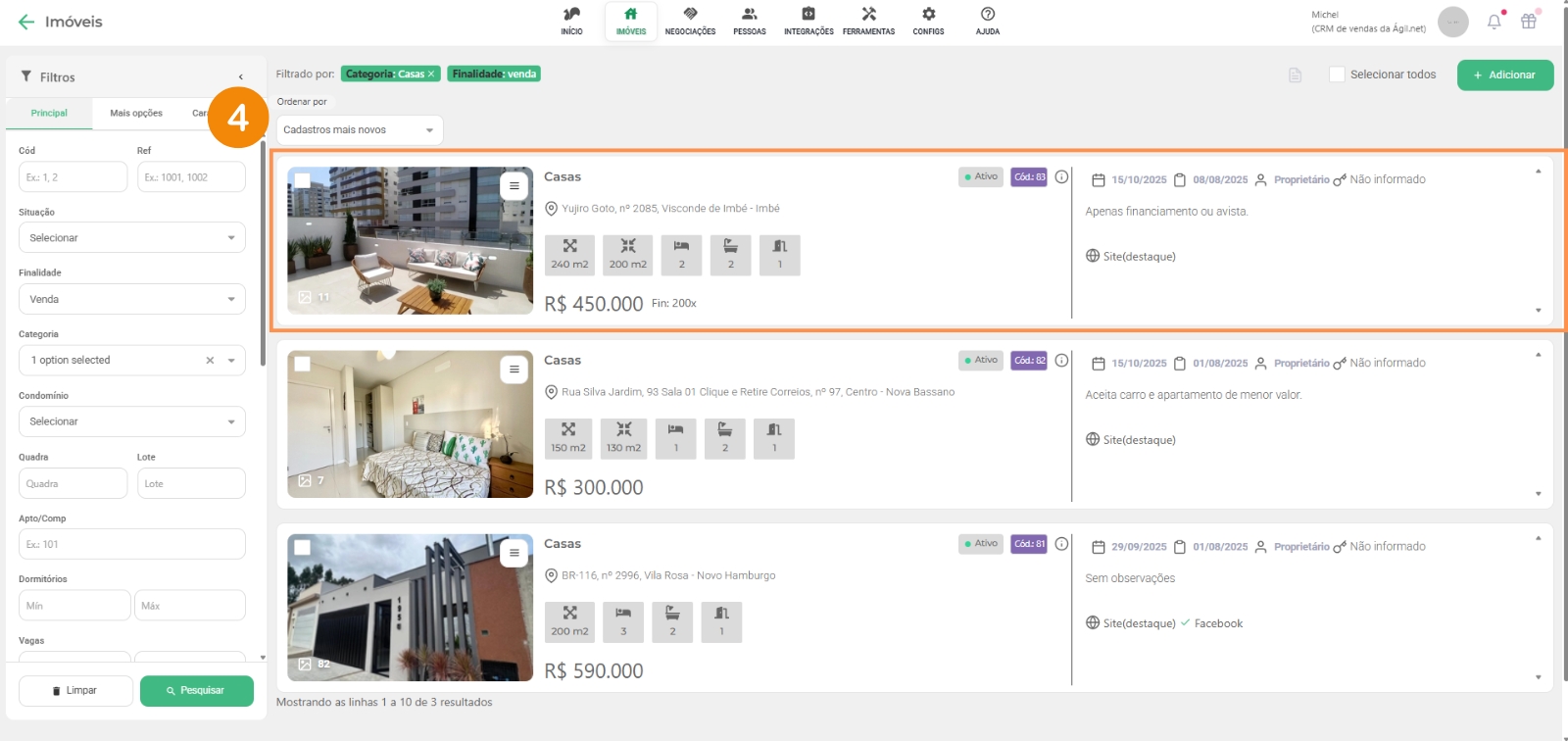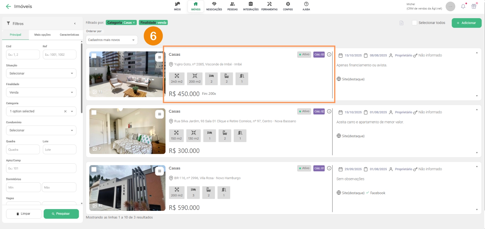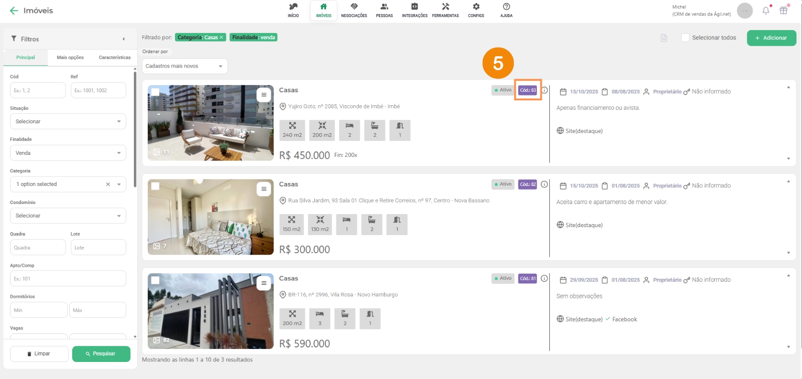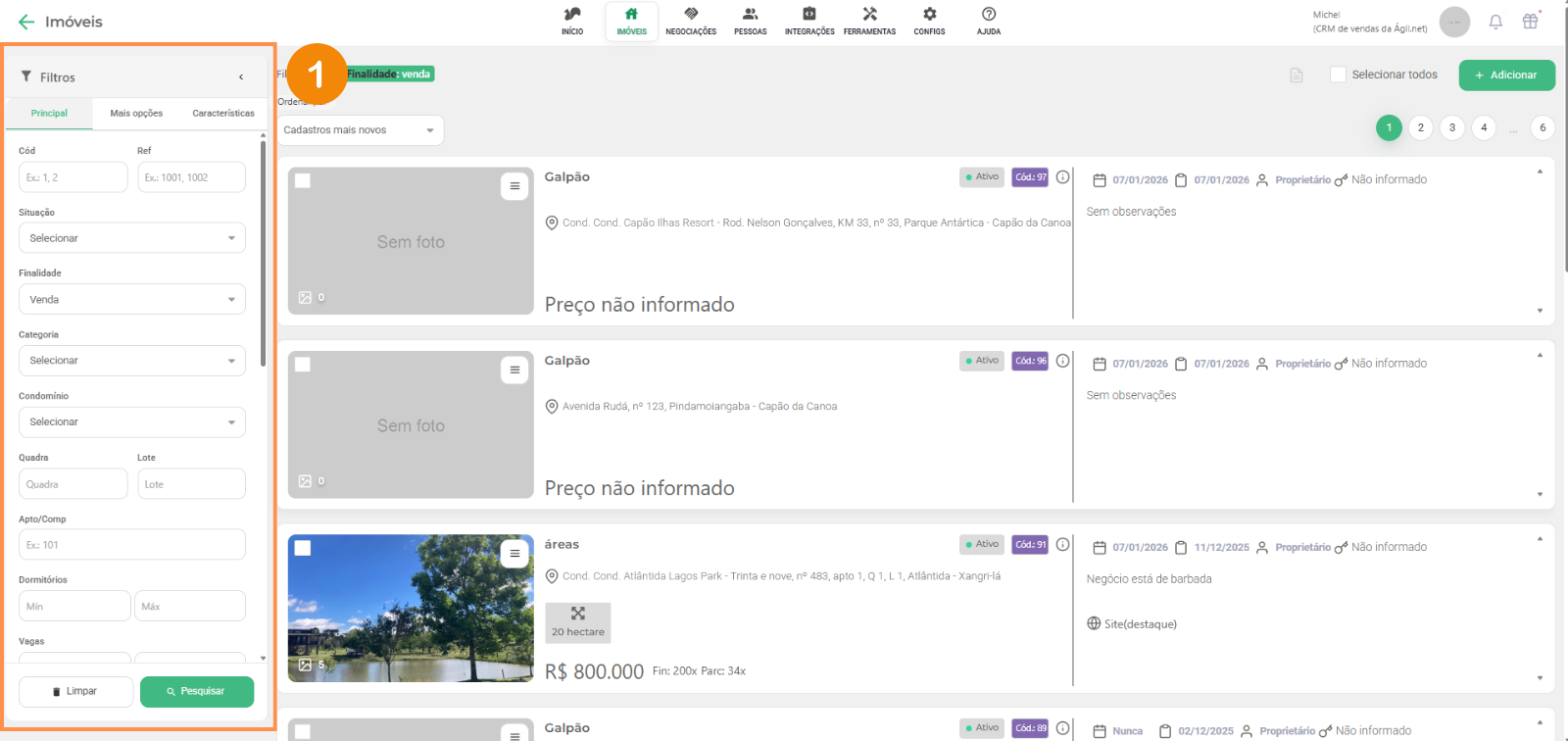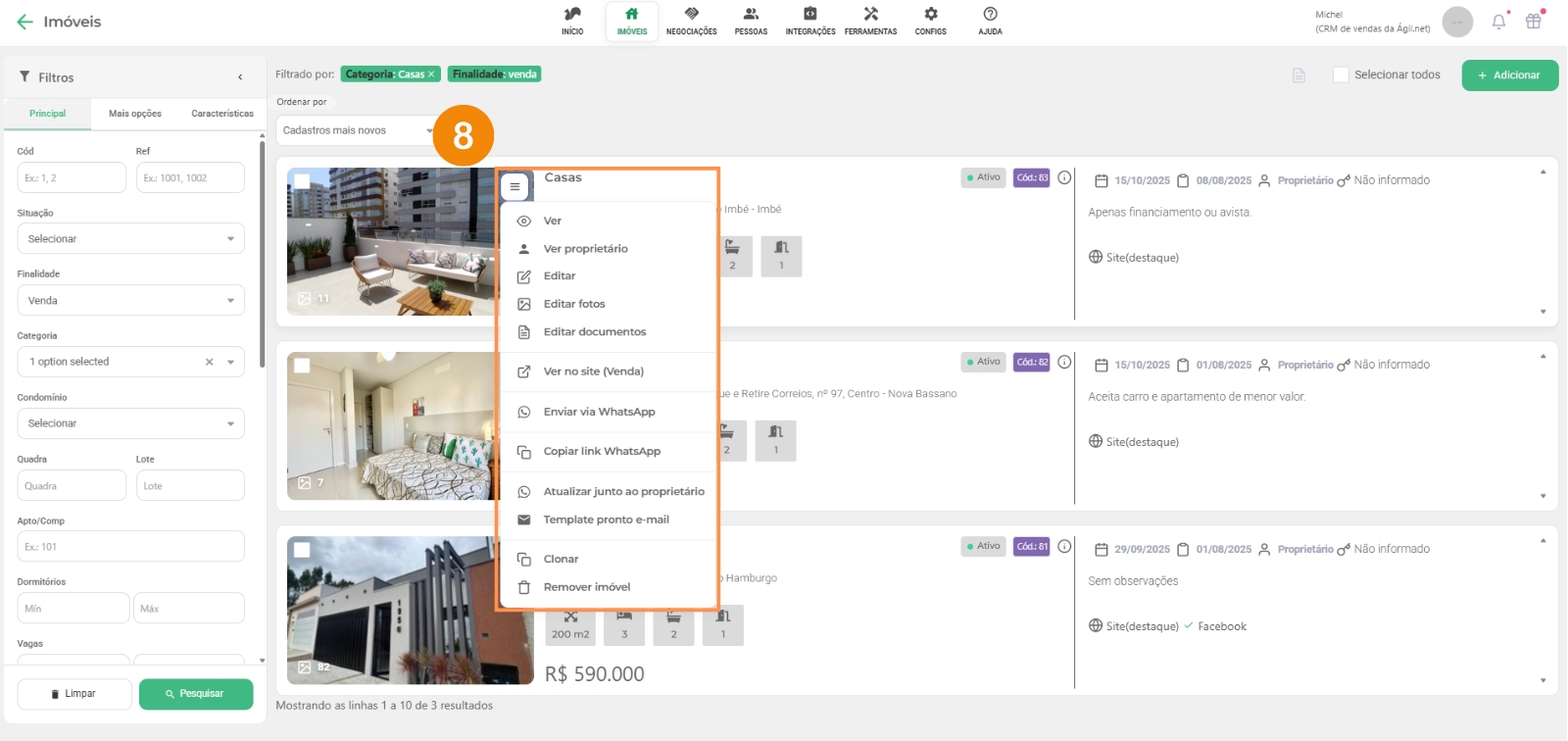 Clicando em “Imóveis” e depois no submenu, “Venda”, mostra todos imóveis ativos (tem outras abas como locação e locação temporada no submenu), você terá algumas opções para sua administração: