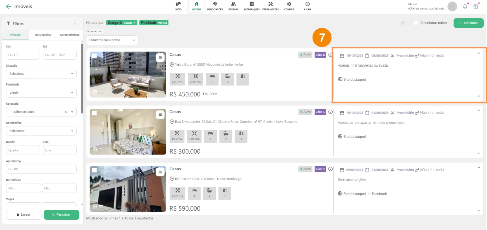 7 – Aqui temos algumas informações importantes também, como proprietário (você pode clicar no proprietário que abrirá as informações dele), onde o imóvel foi marcado, site, destaque, algum portal de anuncio, total de fotos deste imóvel, onde se encontram as chaves, diversas informações para facilitar o corretor na hora da negociação;