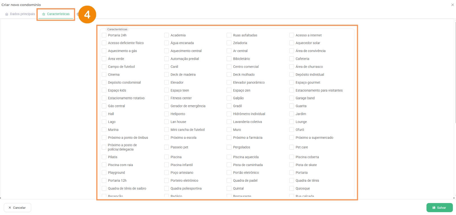 4 – Em seguida, será possível adicionar diversas características ao condomínio que está sendo cadastrado, tais como portaria 24 horas, brinquedoteca, salão de festas com churrasqueira, entre outras. Também é possível incluir novas características, bem como excluí-las ou reorganizá-las, permitindo priorizar aquelas que, em sua avaliação, são mais relevantes para que o cliente visualize em primeiro lugar.