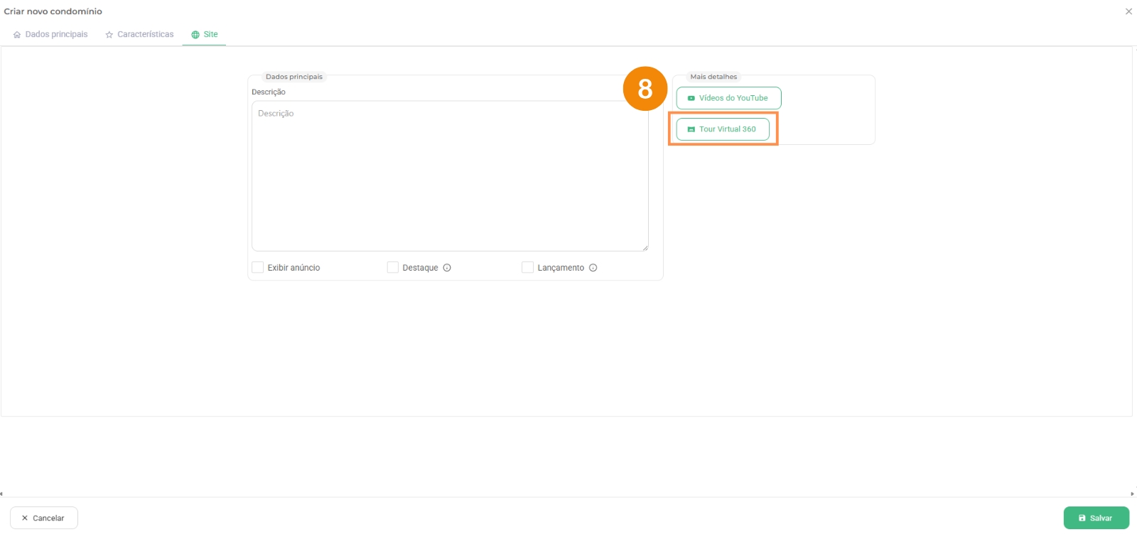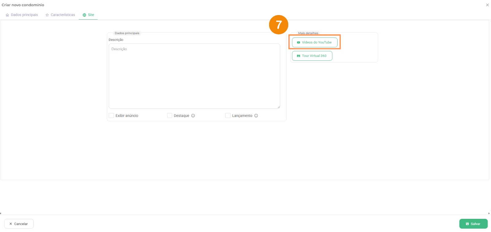 7 – Nesse campo você pode adicionar o link de um vídeo do Youtube que seja desse empreendimento;