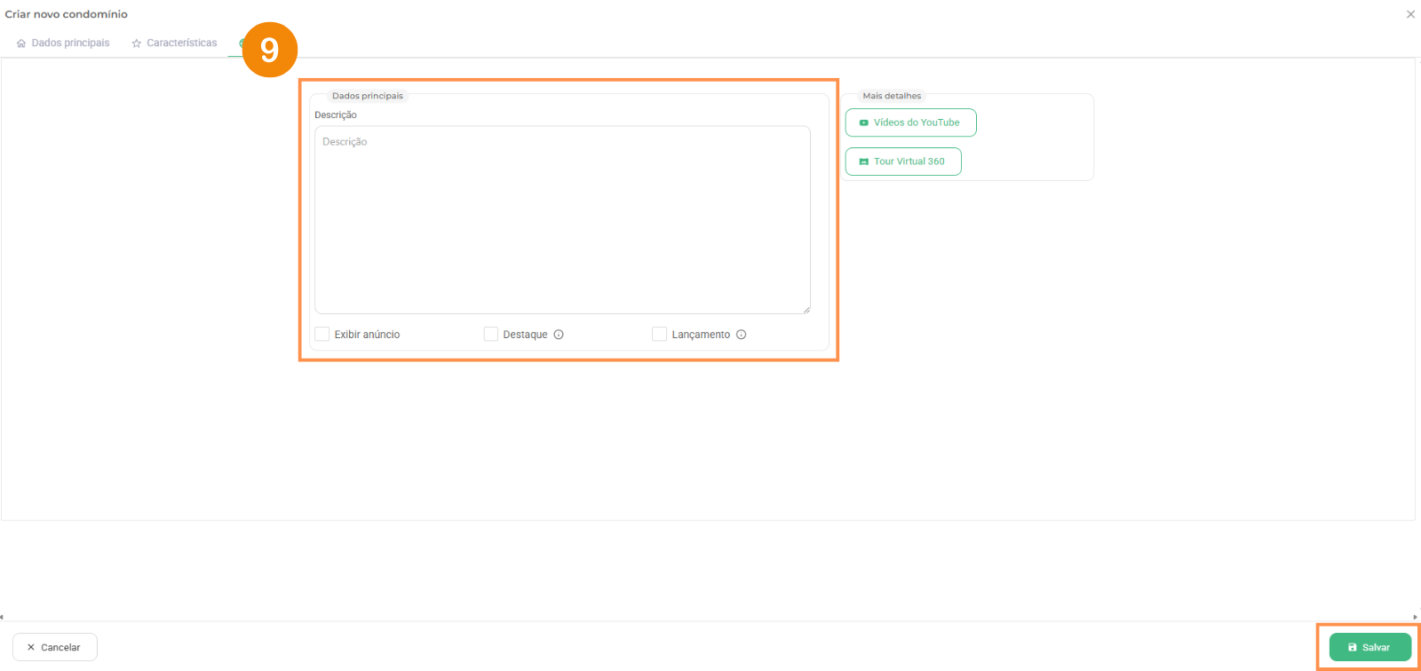 9 – Agora você vai adicionar a descrição do condomínio e preencher as lacunas abaixo caso queira que o condomínio apareça no site e destaque caso queria que ele apareça logo que o cliente entrar no site. Após isso, basta clicar em “Salvar“;