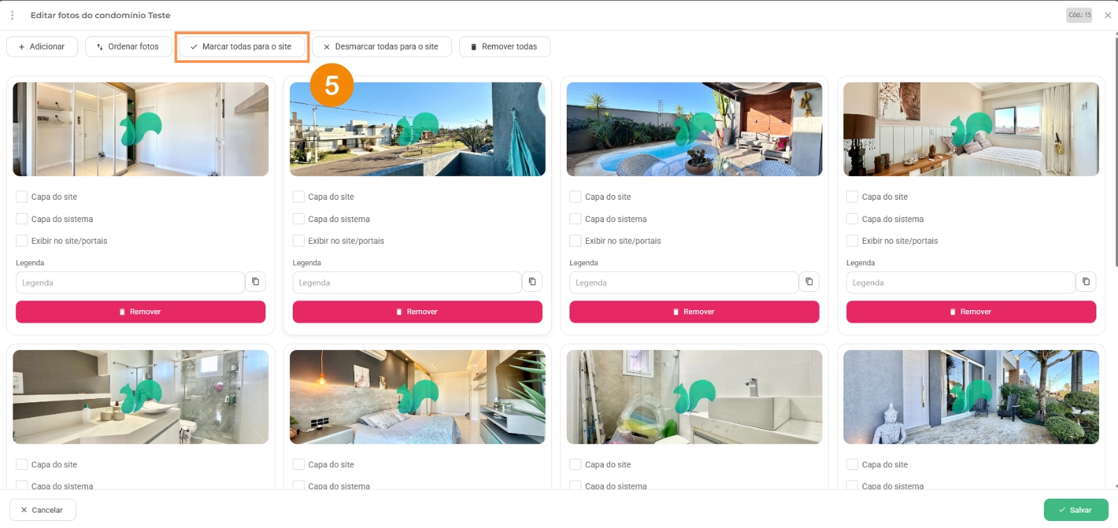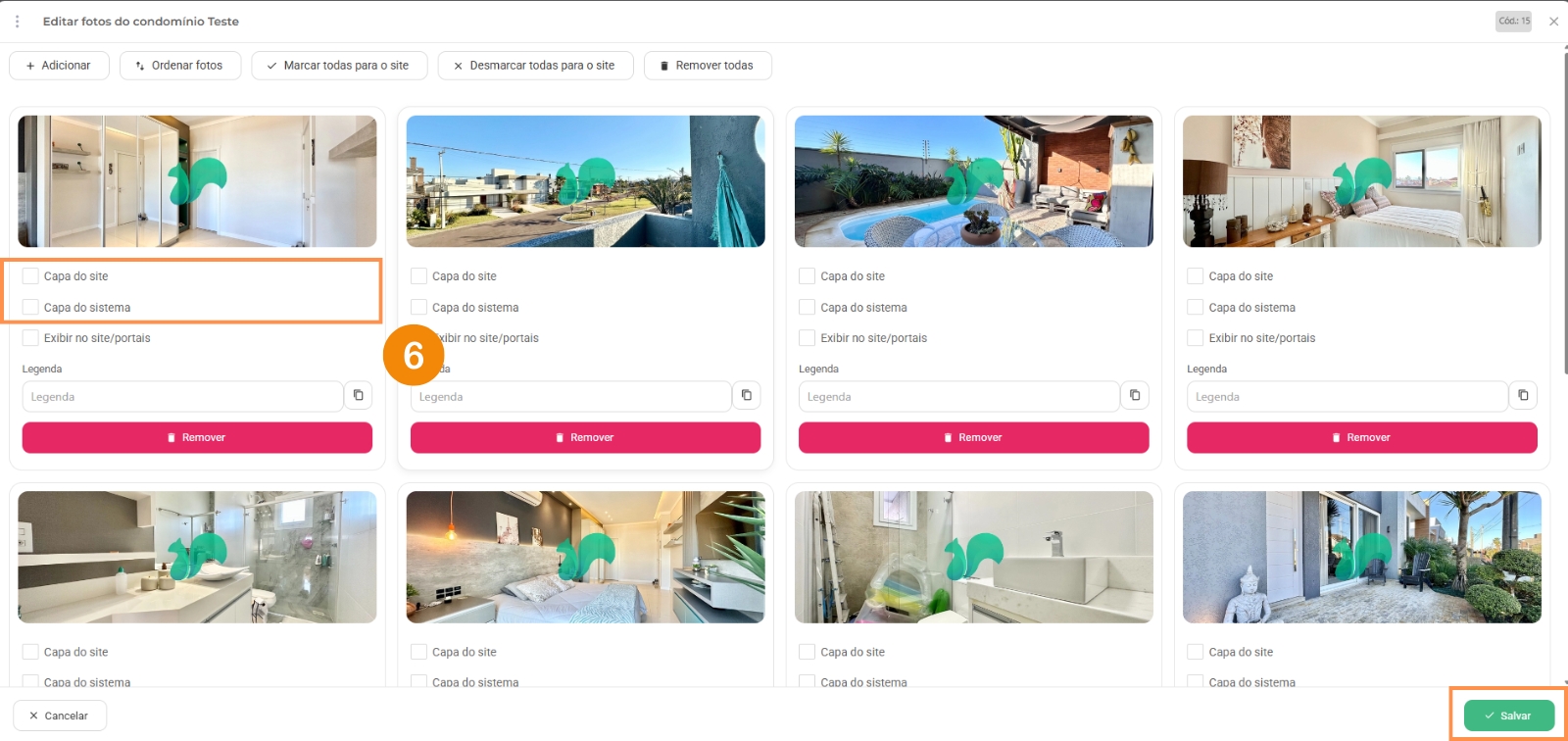 6 – Quando todas as fotos estiverem marcadas para o site, você precisa marcar qual foto será de capa do sistema (foto de capa do imóvel que aparece dentro do sistema) e capa do site (foto de capa do imóvel que aparece dentro do site), depois clique em “salvar“.
